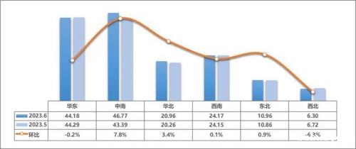 区域方面,2023年6月,华东、西北地区环比5月有所下降,其他各区域均有不同程度的增长。其中,中南地区环比增长幅度最大、交易量最多,其6月交易量为46.77万辆,环比增长7.8%;西北地区是本月降幅最大的区域,环比下降了6.3%,二手车交易量6.30万辆。